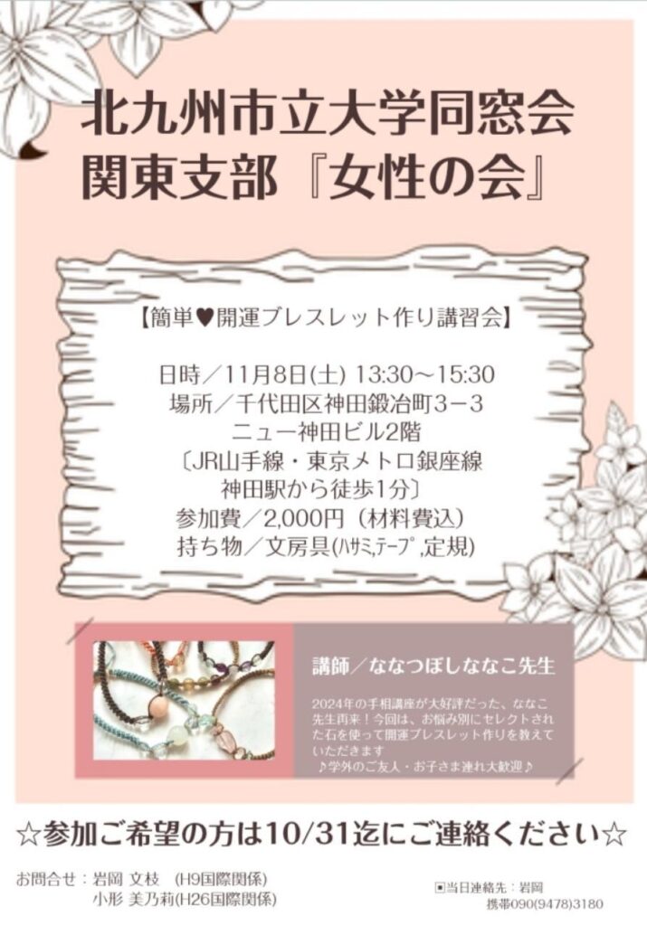 さて掲題の件、今年度の『女性の会』活動のイベントとして 、来る11月8日(土)に【簡単♥開運ブレスレット作り講習会】を講師を招いて開催予定です。